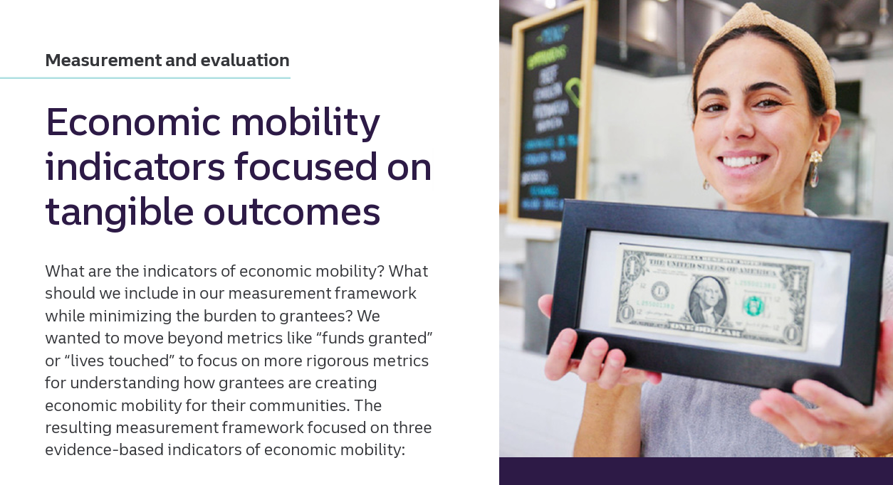Excerpt from report: “What are the indicators of economic mobility? What should we include in our measurement framework while minimizing the burden to grantees? We wanted to move beyond metrics like ‘funds granted’ or ‘lives touched’ to focus on more rigorous metrics for understanding how grantees are creating economic mobility for their communities.”
